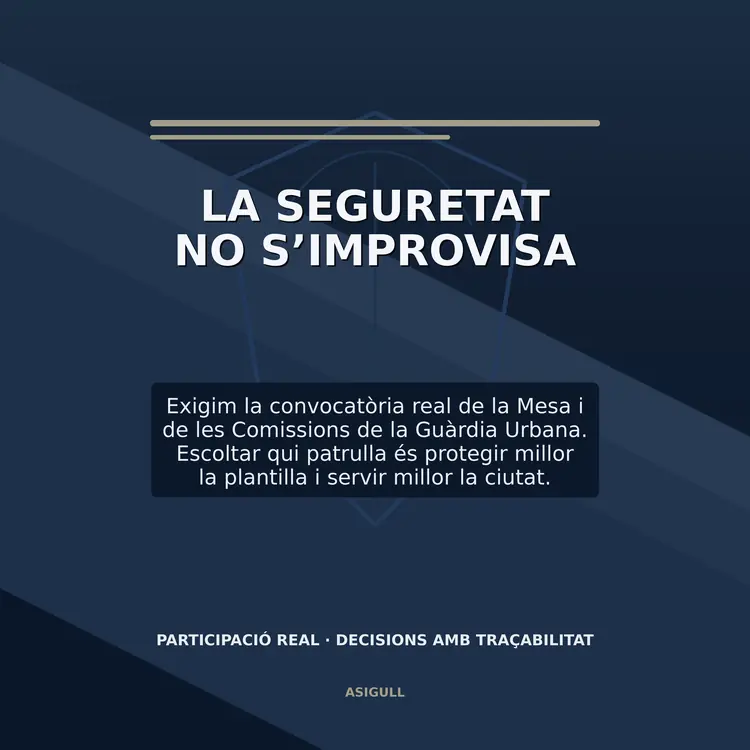 ASIGULL reclama la convocatòria de la Mesa de la Guàrdia Urbana i de les seves quatre comissions permanents, amb calendari, documentació prèvia i retorn escrit. Quan les decisions sobre formació, vehicles, EPIs o vestuari es prenen sense escoltar qui patrulla, no només es perjudica la plantilla: també es ressent el servei que rep la ciutadania.